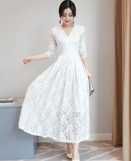 大柄なフラワー刺繍が施されたレーストップスにプリーツロングスカートを合わせたロングドレス。