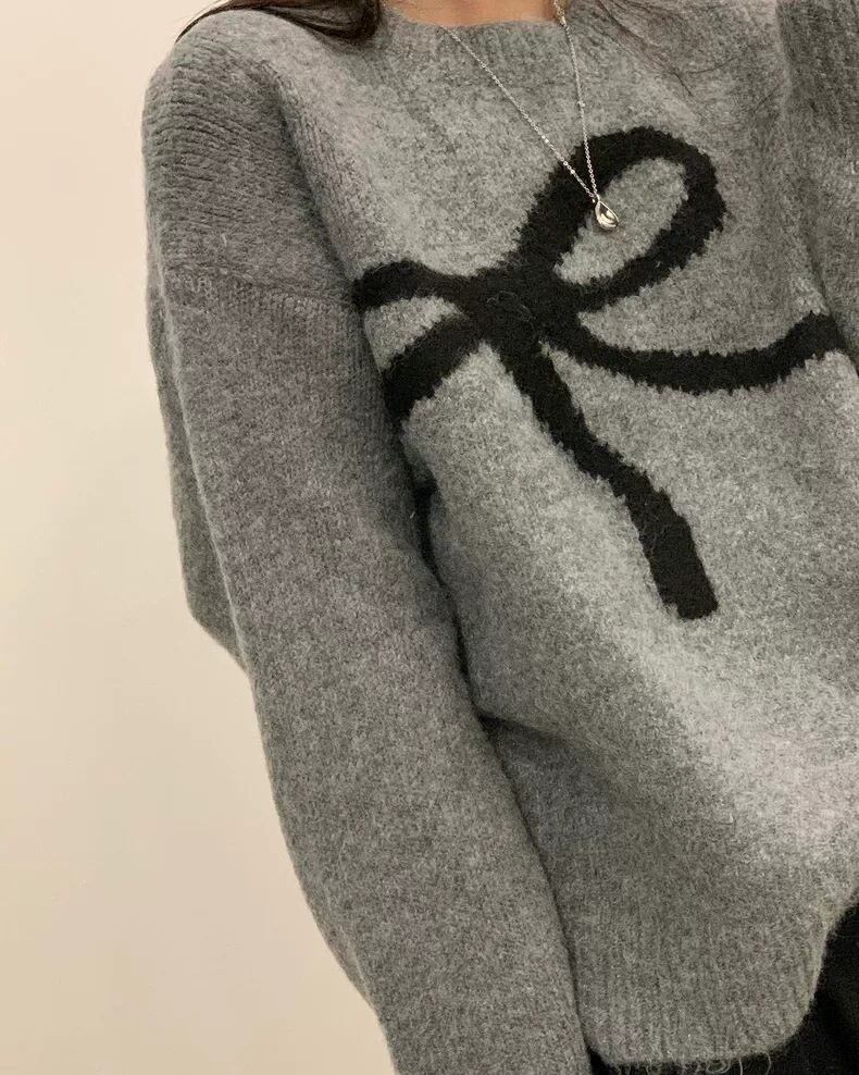 ・甘めのリボン柄に落ち着いた配色で大人っぽく仕上げるニットトップス。