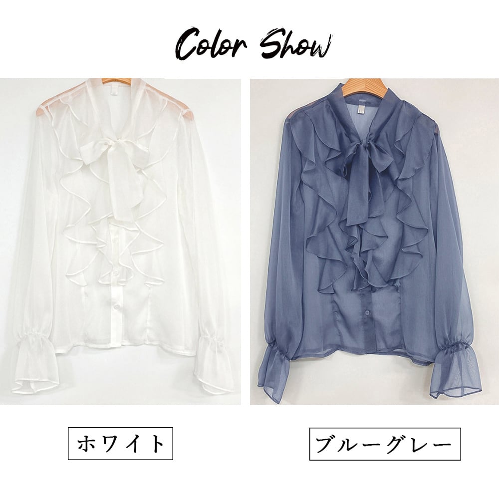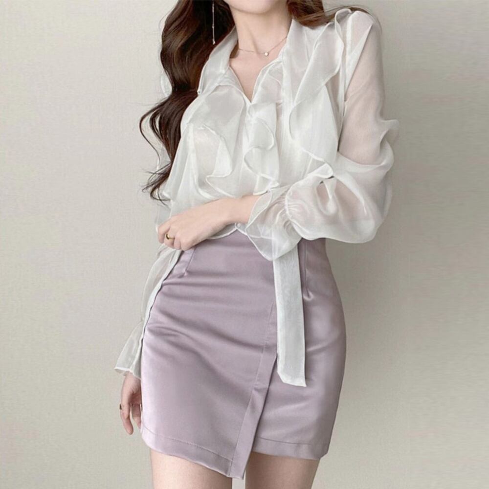 夏らしい清涼感と軽やかさを出しつつ、大人の女性らしい上品な雰囲気に仕上げてくれるフリルシアーブラウス