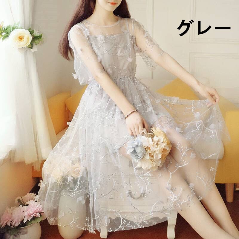 花柄 刺繍 ロングワンピース チュール ミモレ丈ワンピース レディース キャミソールワンピース 半袖