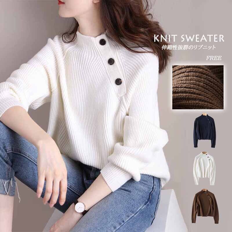 レディース セーター ニット リブ トップス ゆったりハイネック きれいめ 美シルエット 無地